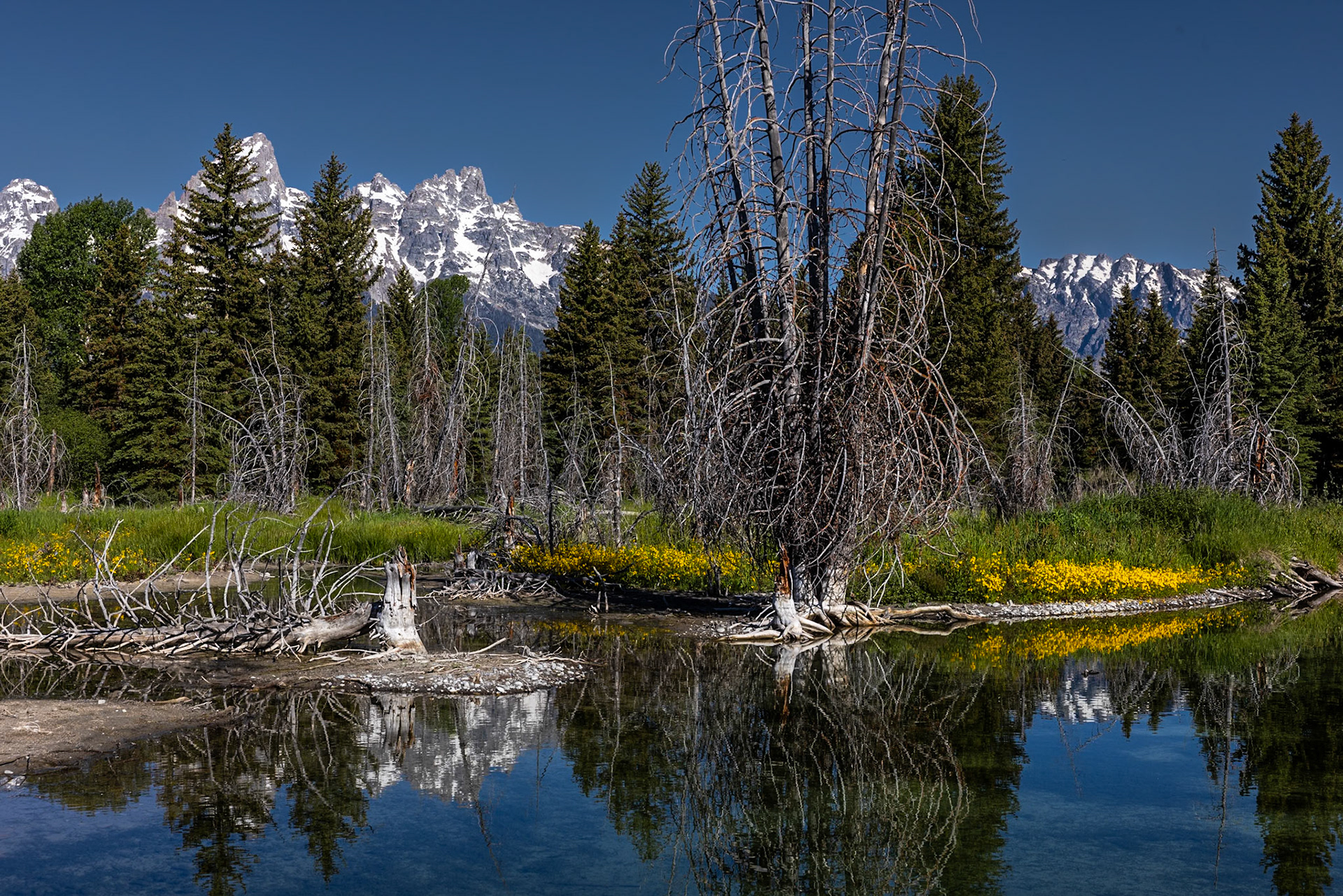 The park -- and especially the Teton Range -- is one of the most photographed places in the world. Yet this place offers unending opportunities for photographic creativity and originality. Yes, sunrise at Jenny Lake, Schwabacher Landing or Oxbow Bend are magical places that you must photograph, but there is so much more off the beaten path. Always have your camera near by while driving since wildlife sightings can be unpredictable and sudden. While parts of the park are closed to traffic in the winter, many areas remain accessible year round. When the snow comes and the road between Taggart Lake and Signal Mountain is closed to cars, it's open for cross country skiing. The same applies to much of Moose-Wilson Road. Again, have the camera close by.